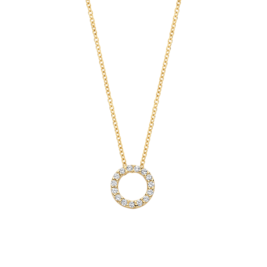 Dit stijlvolle 14kt geelgouden halsketting heeft eencirkelvormige hanger met zirkonia’s in pavé-zetting. De doorsnede van de hangeris 7,3 mm. Elegant op zichzelf of in combinatie met andere sieraden uit onzecollectie.DE BRUYLOFT zorgt ervoor dat het juweel steeds verpakt in hetoriginele doosje van BLUSH.