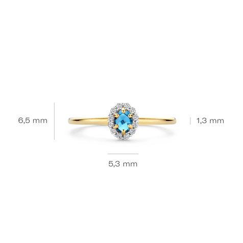 Deze 14kt geelgouden ring springt in het oog door helderblauwe topaas omringd door zirkonia. De band heeft een doorsnede van 1,3 mm en de ringis prachtig te combineren met een of meer andere (aanschuif)ringen uit onze collectie.