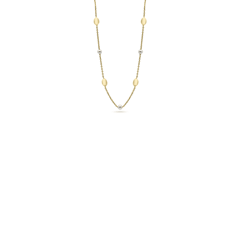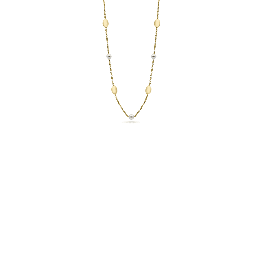 Laat je verleiden door dit mooi juweel 06C0654. Deze halsketting is vervaardigd uit geelgoud 18kt en bevat afwisselend ovale matte elementen en zoetwaterparels.
