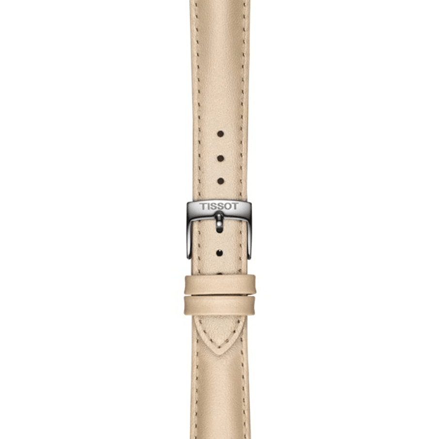 Dit Tissot PR 100 Quartz-model heeft een 34 mm roestvrijstalen kast met roségouden PVD-coating. De witte parelmoer wijzerplaat is goed beschermd onder een krasbestendig saffierglas. De lederen band, crème kleur, is eenvoudig te vervangen dankzij het quick release systeem.