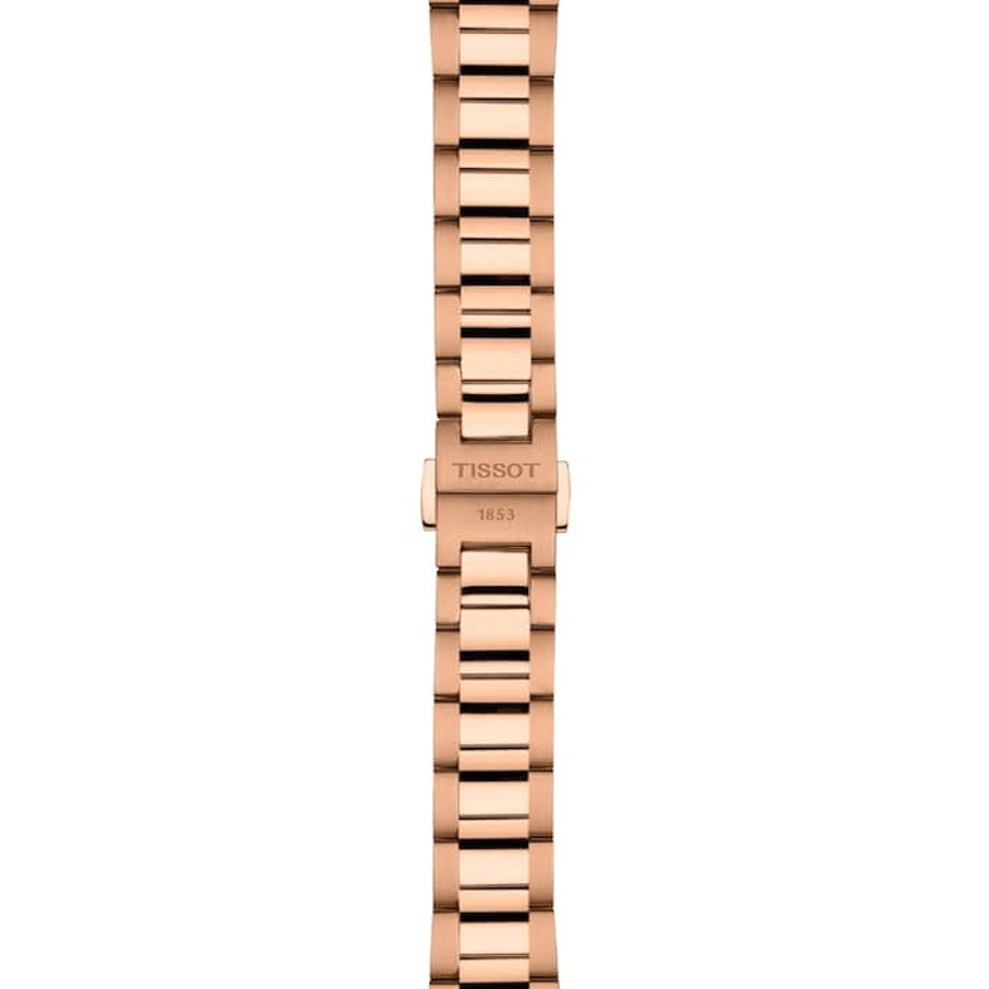 DitTissot PR 100 Quartz-model heeft een 34 mm roestvrijstalen kast met roségouden PVD coating. De bruine wijzerplaat is goed beschermd onder eenkrasbestendig saffierglas. De roestvrijstalen armband is eenvoudig tevervangen dankzij het quick release systeem.