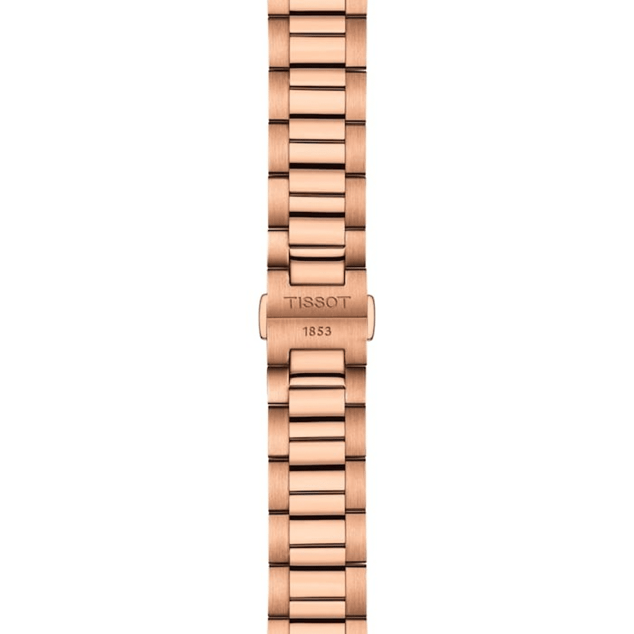 DitTissot PR 100 Quartz-model heefteen 40 mm roestvrijstalen kast met roségouden PVD coating. De zwartewijzerplaat is goed beschermd onder een krasbestendig saffierglas. Deroestvrijstalen armband met roségouden PVD coating is eenvoudig tevervangen dankzij het quick release systeem.