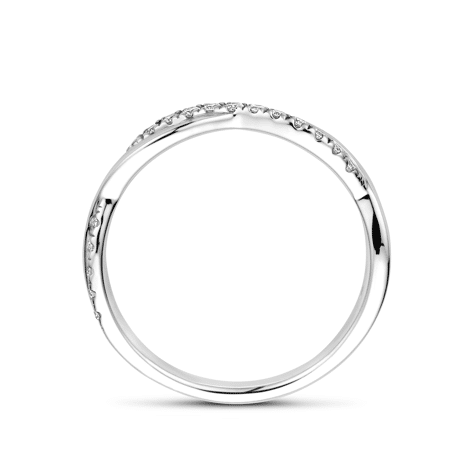 Deze verfijnde damesring, vervaardigd uit 18 karaat wit goud, heeft een elegante, gedraaide band die een dynamische en moderne uitstraling biedt.
