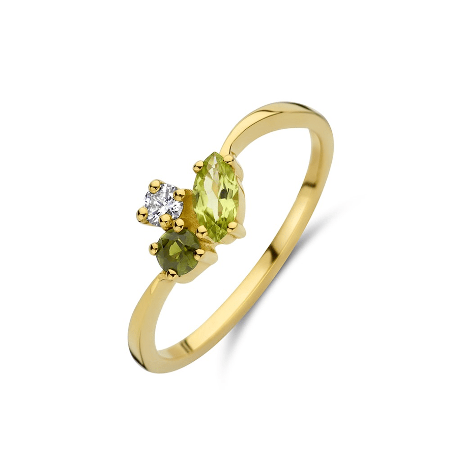 Laat je verleiden door deze prachtige ring, vervaardigd uit geelgoud 18kt. Deze ring is bezet met een natuurlijke diamant, briljant geslepen, totaal karaat 0.08ct in de diamantkwaliteit G/SI. Verder is de ring bezet met een peridoot, markies geslepen en een groene toermalijn.